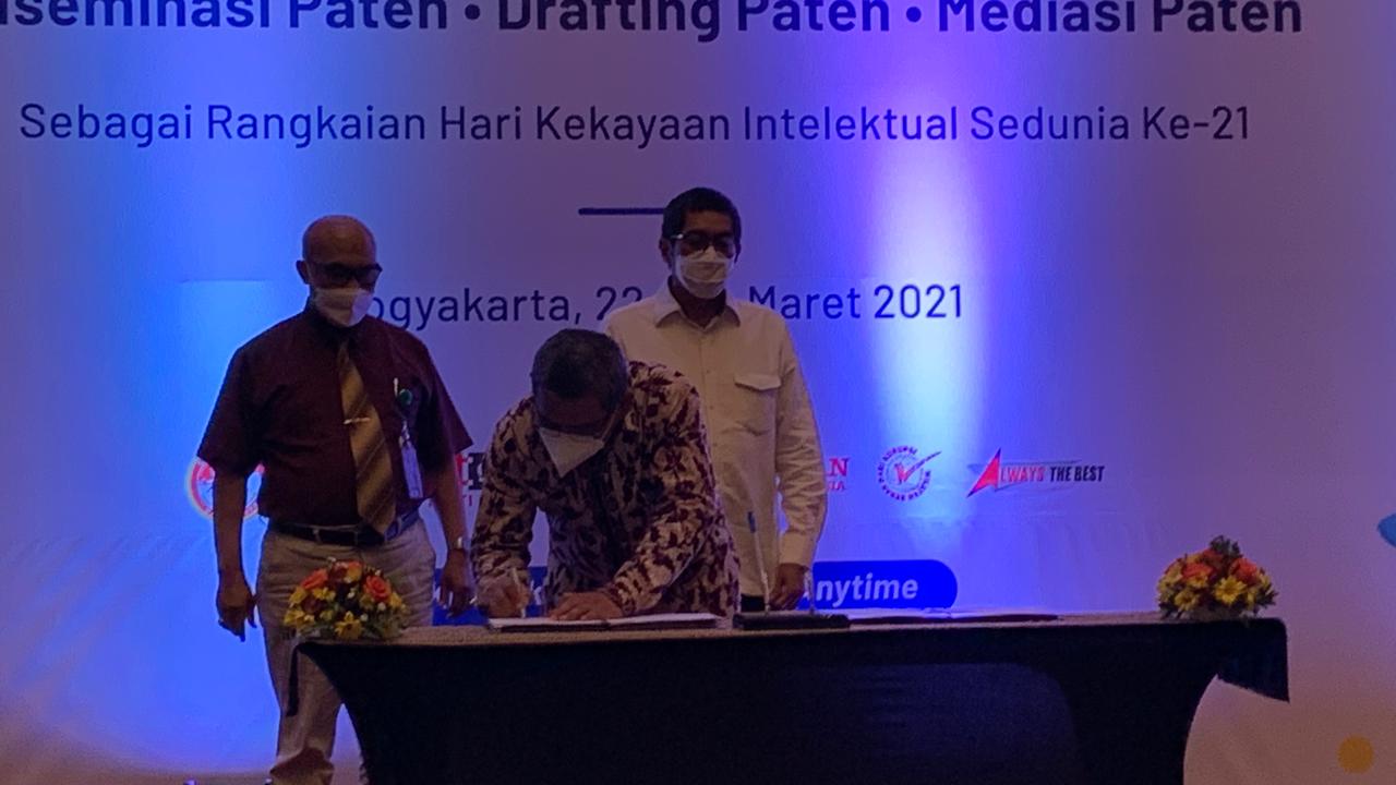 Yogyakarta (24/3) sebagai tindak lanjut dari Nota Kesepahaman (NK) antara Kementerian Riset, Teknologi, dan Pendidikan Tinggi (Kemenristekdikti) dan Kementerian Hukum dan Hak Asasi Manusia (Kemenkumham) Republik Indonesia yang ditandatangai pada 2019 lalu, Universitas Ahmad Dahlan (UAD) yang berada di bawah naungan Kemenristekdikti dan Direktorat Jenderal Kekayaan Intelektual (DJKI) yang berada di bawah naungan Kemenkumham bersepakat mengadakan perjanjian kerja sama dan menandatangani Perjanjian Kerja Sama dalam hal kekayaan intelektual pada 24 Maret 2021. Penandatangan tersebut bersamaan dengan pelatihan tentang Konsultasi Teknis Paten yang diadakan pada 22 hingga 24 Maret 2021 di Yogyakarta.